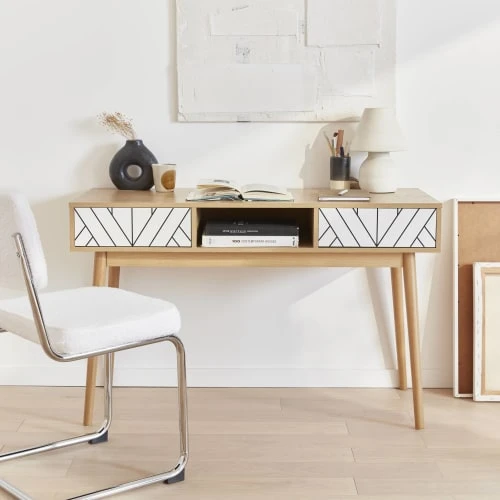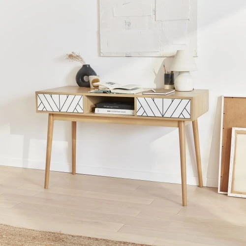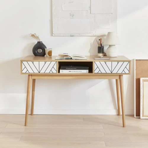 Laissez vous tenter par cette console qui habillera votre intérieur avec élégance. Avec ses 2 tiroirs push sécurisant votre espace et une niche centrale utile pour ranger vos affaires, essayer la console Mika c’est l’adopter ! Son piètement en bois de pin ajoute une touche scandinave à votre intérieur. Pratique, elle se glisse dans les petits espaces et son plateau fonctionnel vous permet d’exposer des objets décoratifs.