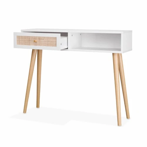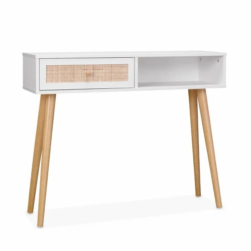 Placée dans un couloir ou dans un salon, cette console apporte du cachet à votre intérieur. Avec ses lignes droites et son tiroir en cannage, elle est élégante et indémodable. Cette console peut aussi être utilisée comme coiffeuse dans une chambre, il suffira de lui ajouter un joli miroir.
