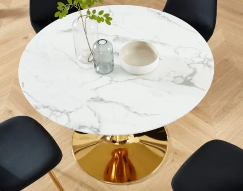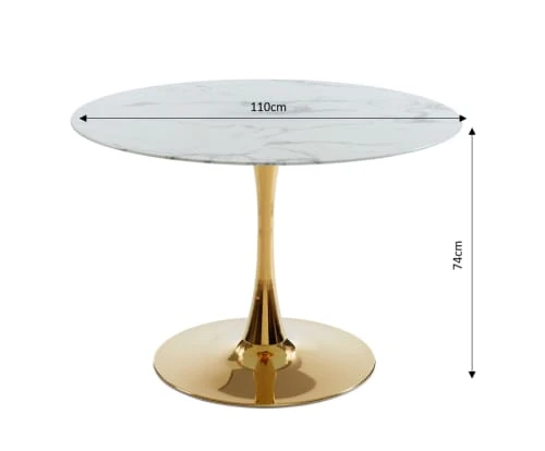 Table à manger MONIKA – Plateau rond en verre trempé avec technologie spéciale effet marbre – Pied en métal doré – Dimensions : D110xH76cm