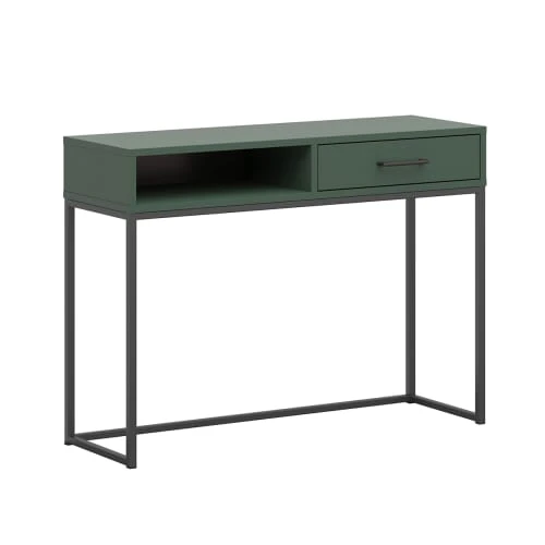 Console bureau 1 tiroir Zoe Vert et Metal Fabrication Européenne – Collection : Zoe – Couleur : Vert foncé mat et noir – Matériaux : Panneaux mélaminés et cadre en bois de Pin – Poignée métallique – Caractéristiques : Console – Bureau – Coiffeuse – 1 tiroir – 1 niche de rangement – Tiroir équipé du système de fermeture silencieuse – Poids et dimensions : 21 kg – 106 x 35 x 78 cm – Produit livré, à monter – Produit garanti 12 Mois.