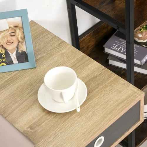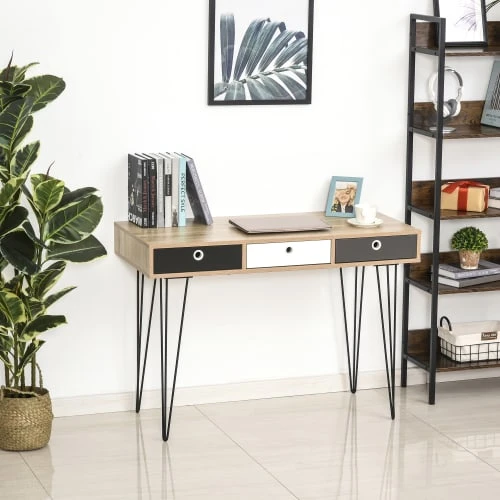– Table console design scandinave mélant avec élégance le métal (pieds épingles noir) et le bois (plateau imitation bois de chêne clair avec veinage et tiroirs tricolores noir, blanc, gris)