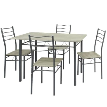 · Ensemble de table et 4 chaises pour salle à manger.· Design attractif.· Grand degré de confort.· Planche de table robuste, disponible en deux finitions ( Imitation Chêne ou Noir).· Poids léger, grande résistance.· Facile à assortir avec tous les genres décoratifs et à s’intégrer dans n’importe quel séjour.· Embouts en plastique qui protègent le plancher de l’usure.· Montage rapide et simple.· Facile à nettoyer.Détails techniques:Chaise:· Dimensions totales maximales de la chaise (longueur x longueurx hauteur): aprox. 38 x 46 x 88 cm.· Dimensions de la superficie de l’assise (longueur x longueur): aprox. 40.5 x 39.5 cm.· Hauteur du dossier : aprox. 52 cm.· Hauteur de l’assise : aprox. 47.5 cm.·Diamètre des pieds de la chaise : aprox. 2.2 cm.· Poids maximales supporté pour chaque chaise : 100 kg.· Poids de chaque chaise : aprox. 4.2 kg.· Matériel: Acier + MDF.Table:· Dimensions totales maximales de la table ( longueur x longueurx hauteur): aprox. 110 x 70 x 76 cm.· Épaisseur de la planche de la table : aprox 10 mm.· Poids maximum supporté pour la table: 60 kg.· Poids de la table : aprox. 18.5 kg.· Matériel: acier et MDF.