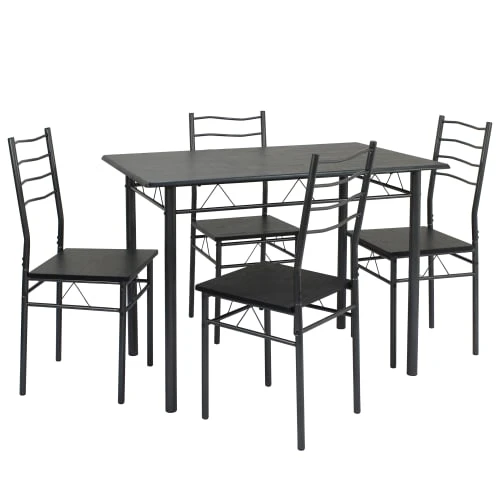 · Ensemble de table et 4 chaises pour salle à manger.· Design attractif.· Grand degré de confort.· Planche de table robuste, disponible en deux finitions ( Imitation Chêne ou Noir).· Poids léger, grande résistance.· Facile à assortir avec tous les genres décoratifs et à s’intégrer dans n’importe quel séjour.· Embouts en plastique qui protègent le plancher de l’usure.· Montage rapide et simple.· Facile à nettoyer.Détails techniques:Chaise:· Dimensions totales maximales de la chaise (longueur x longueurx hauteur): aprox. 38 x 46 x 88 cm.· Dimensions de la superficie de l’assise (longueur x longueur): aprox. 40.5 x 39.5 cm.· Hauteur du dossier : aprox. 52 cm.· Hauteur de l’assise : aprox. 47.5 cm.·Diamètre des pieds de la chaise : aprox. 2.2 cm.· Poids maximales supporté pour chaque chaise : 100 kg.· Poids de chaque chaise : aprox. 4.2 kg.· Matériel: Acier + MDF.Table:· Dimensions totales maximales de la table ( longueur x longueurx hauteur): aprox. 110 x 70 x 76 cm.· Épaisseur de la planche de la table : aprox 10 mm.· Poids maximum supporté pour la table: 60 kg.· Poids de la table : aprox. 18.5 kg.· Matériel: acier et MDF.