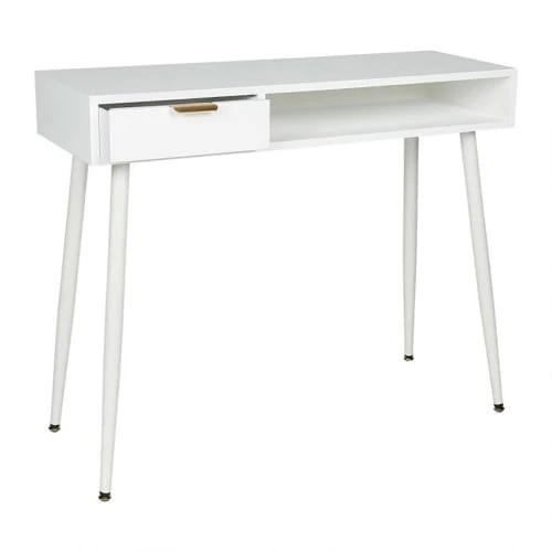 Conçue en bois, cette console blanche dispose d’un tiroir pour y ranger vos petits objets ainsi que d’une étagère ouverte pour y disposer divers documents.