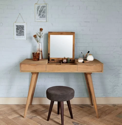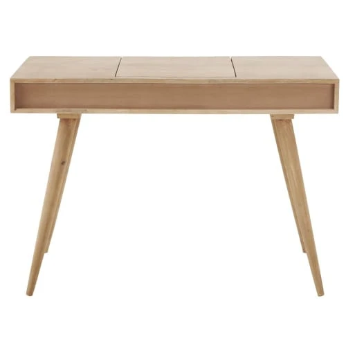 Conçu en bois de manguier massif, ce meuble coiffeuse TROCADERO est doté d’un miroir repliable au centre. Côté rangement, cette coiffeuse dispose de 3 tiroirs dont un tiroir central avec 4 compartiments pour ranger votre maquillage et vos bijoux. Le détail déco : son look vintage avec ses pieds hauts et légèrement évasés. Notre conseil : vous pouvez également l’utiliser comme bureau et l’accompagner d’une jolie chaise.