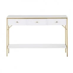 MĂŞlant raffinement et sobriĂ©tĂ©, bois massif et fer vieilli, teinte immaculĂ©e et Ă©clat prĂ©cieux, la console 3 tiroirs en acacia blanc IZMIR s’affranchit des codes. Au contact d’une structure minimaliste en laiton vieilli, le bois d’acacia rĂ©vèle toute son Ă©lĂ©gance et sa robustesse. Vous pourrez ranger toutes vos affaires dans les trois tiroirs de cette console blanche, tandis que vos objets dĂ©co favoris prendront place sur son grand plateau.