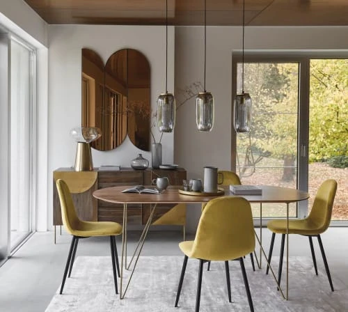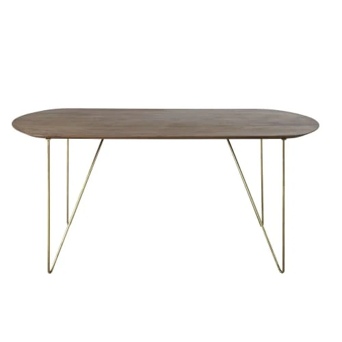 Avec sa ligne effilée, la table à manger ovale en acacia 6 personnes L175 MYFAIR soufflera une ambiance vintage pour le plaisir de votre intérieur. Son plateau en acacia teinté et verni se repose sur un piétement en fer à la finition en laiton vieillie. Vous pouvez également penser aux assises qui épauleront vos repas sur la table à dîner en bois: pieds assortis, tabouret rétro, chaises en bois peintes ? A vos idées !