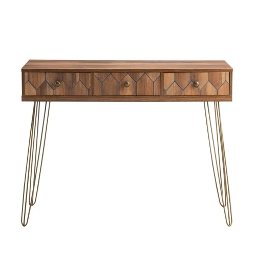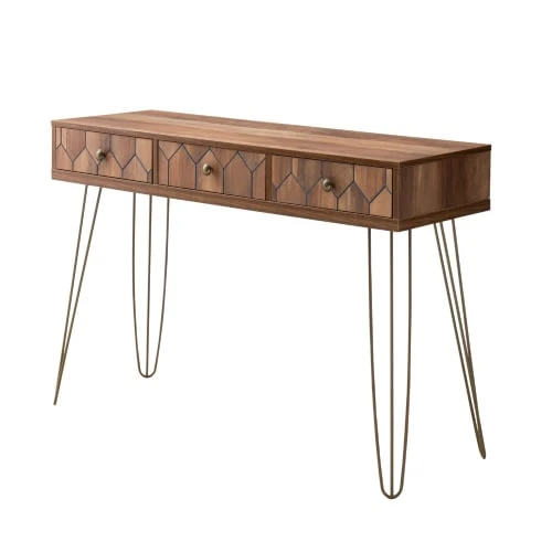 La console moderne Orianis, c’est une proposition universelle, qui va bien avec chaque intérieur. Le meuble est commencé par les pieds beaux en forme qui ressemble aux épingles à cheveux (hairpin legs). La couleur dorée et le design extraordinaire captivent l’attention. Sur cette base, il y a un corpus minimaliste, qui enchante de front de la facture tridimensionnelle. Le produit est équipé de 3 tiroirs spacieux qui peuvent remettre l’ordre dans votre intérieur. La construction est finie avec le plateau large. Grâce à ces caractéristiques, la console Orianis peut vous donner la place de travail du haut confort.
