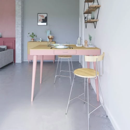 Ses 4 pieds en hêtre massif fuselés lui apportent légèreté et élégance, et ses 2 tiroirs de chaque côté, une ligne raffinée grâce à leurs fines poignées en cuir.