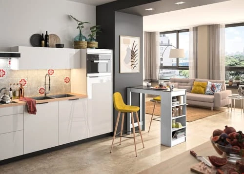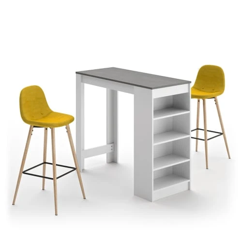 Animez votre intérieur avec cette table-bar ou îlot central et ses chaises hautes tapissées conçues pour vos moments de partage, en famille ou entre amis.