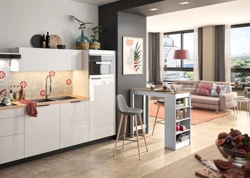 Animez votre intérieur avec cette table-bar ou îlot central et ses chaises hautes tapissées conçues pour vos moments de partage, en famille ou entre amis.